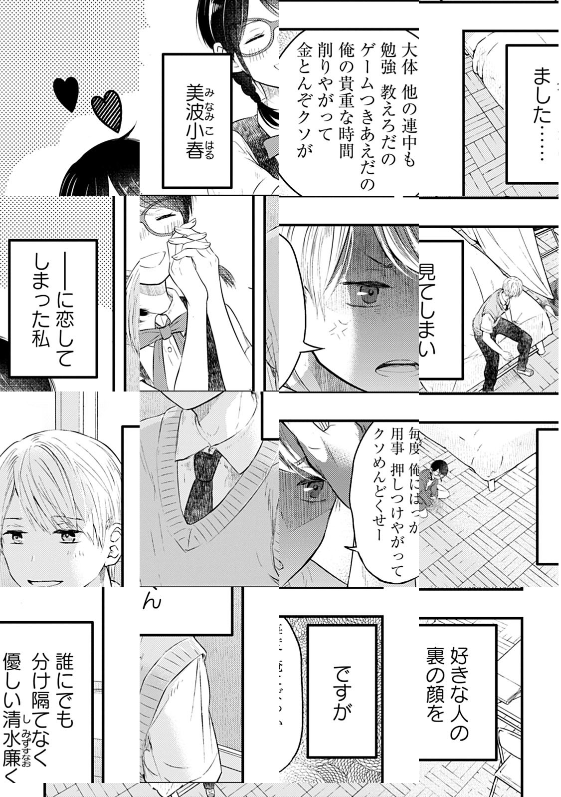 何をするにも間が悪い美波小春は、クラスで人気の清水くんに片思い中。そんな彼女はふとしたきっかけで、清水くんの本性を知ってしまう。